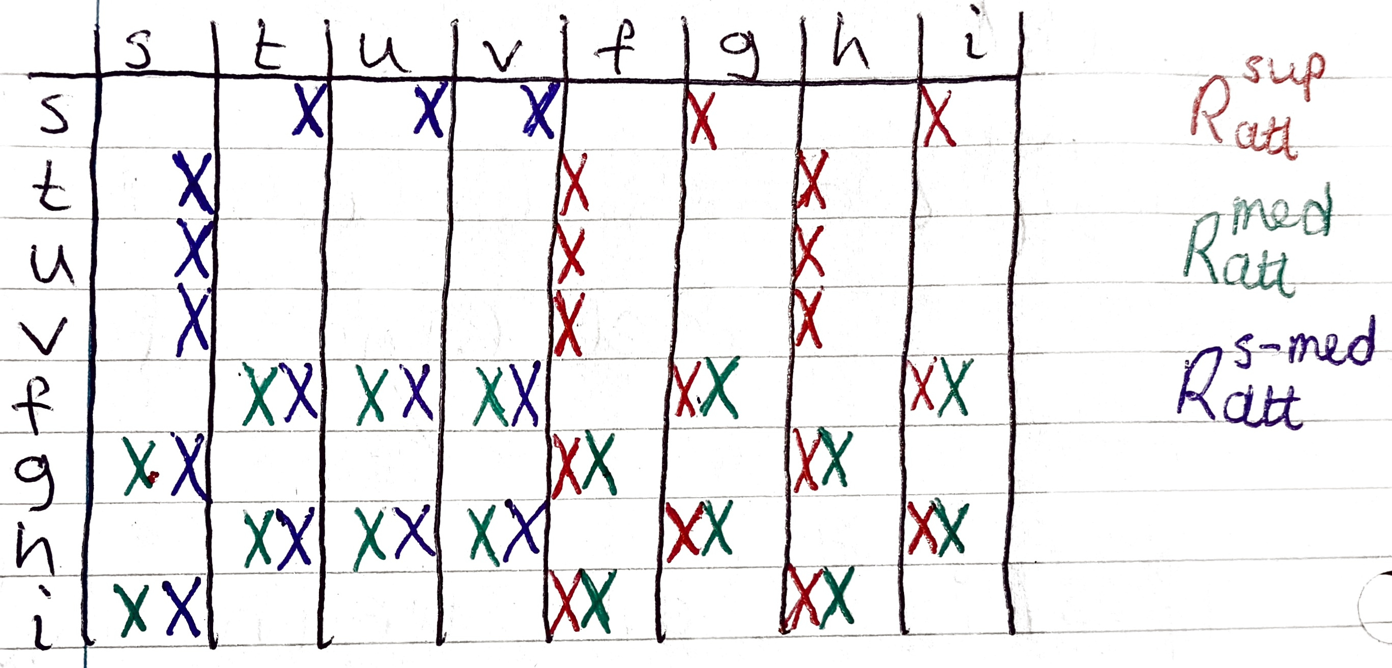 Fig. 4 shows the \(\suppattack\), \(\medattack\) and \(\smedattack\) relations for the BAF from Fig. 3. By the above proposition, \(\secattack\) is obtained by symmetry from \(\suppattack\), so is omitted here.