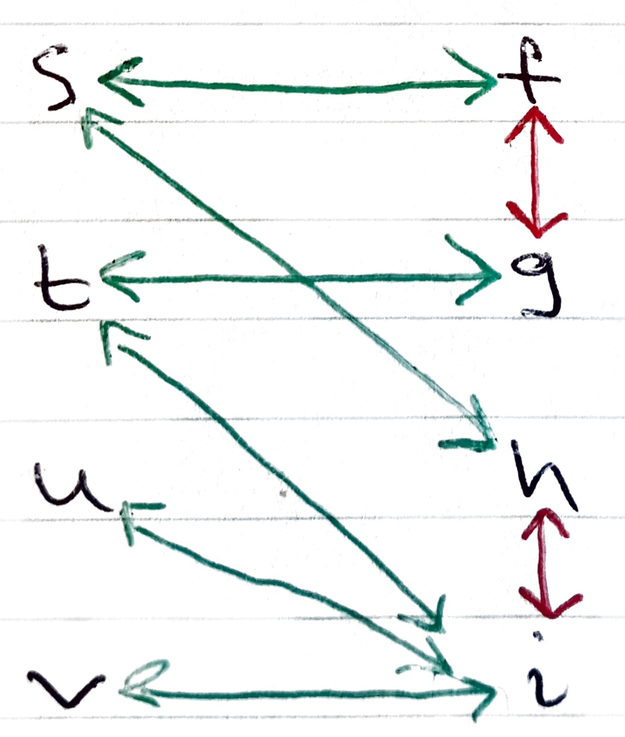 Clearly \(f\) “attacks” \(t\) but not \(s\) or \(u\). However, \(s\) and \(u\) clearly have a different relationship with \(f\): \(s\)’s trustworthiness is supported by belief in \(f\), whereas \(u\) is unrelated.