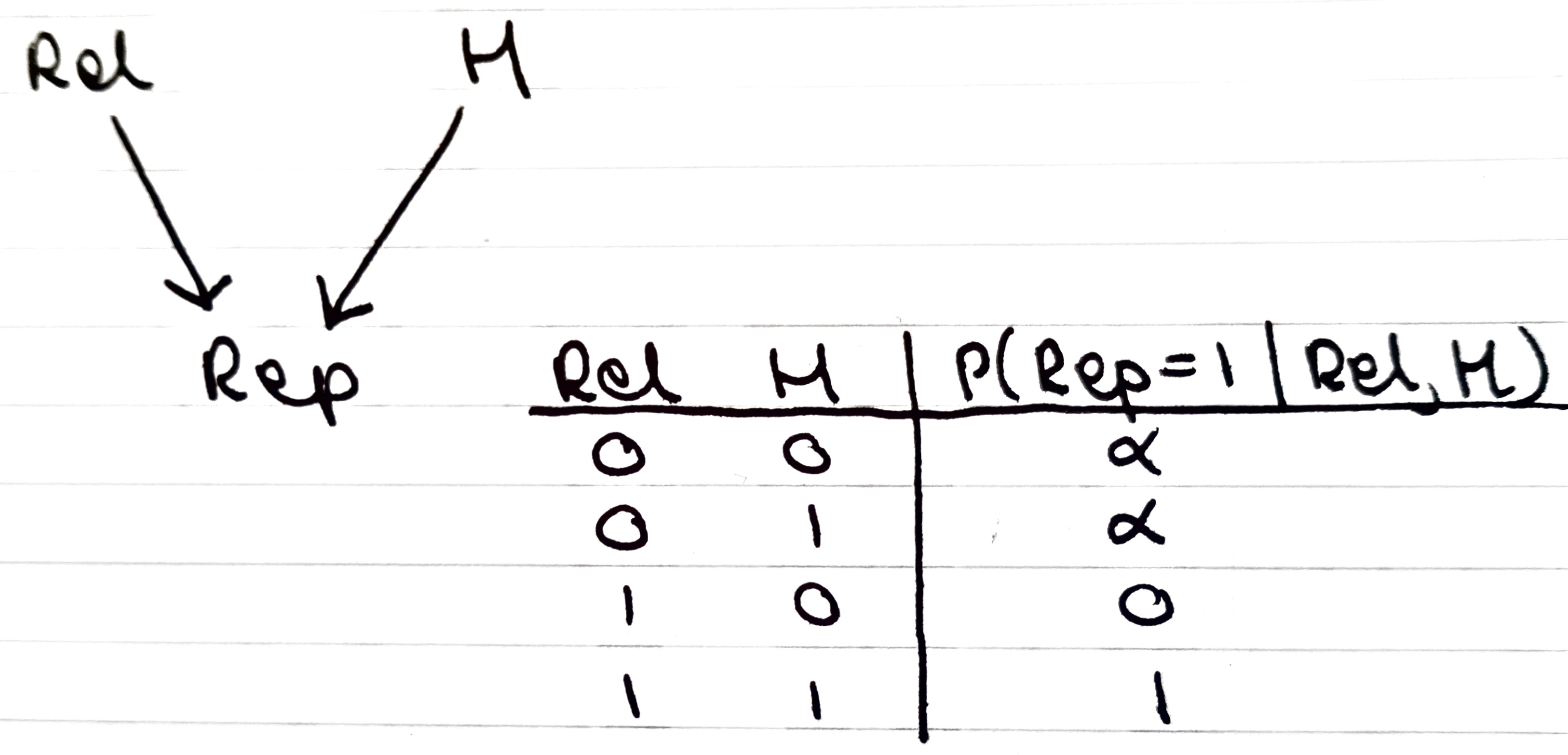 \(\alpha\) is a parameter determining the probability of an unreliable source saying \(H\) is true (note that \(rep\) is independent of \(H\) in this case)